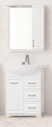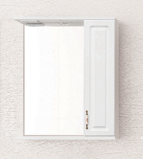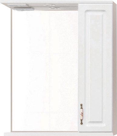 Описание: зеркальное полотно с распашным шкафчиком и нижней полкой. В козырьке встроенный светильник, выключатель с розеткой. Декоративная фрезеровка фасада, декорированные ручки "под бронзу" с керамическими вставками и изящным рисунком. Стеклянные полочки в зеркальных шкафах. Край полочек имеет трапецевидную еврокромку. Прозрачные полкодержатели с фиксацией