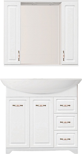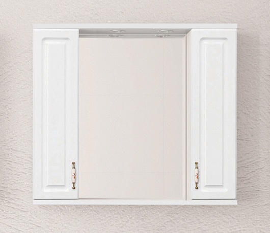 Описание: зеркальное полотно с распашными шкафчиками и нижней полкой. В козырьке встроенные светильники, выключатель с розеткой. Декоративная фрезеровка фасада, декорированные ручки "под бронзу" с керамическими вставками и изящным рисунком. Стеклянные полочки в зеркальных шкафах. Край полочек имеет трапецевидную еврокромку. Прозрачные полкодержатели с фиксацией