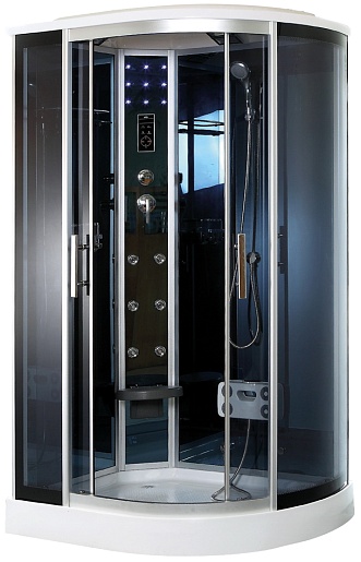 Душевая оснащена ручным душем с удобной лейкой и четырёхрежимным смесителем. Есть тропический душ, а также гидромассаж, в том числе отдельный для спины, имеется массажёр ступней. Установлено откидное сиденье, позволяющее ощутить полный релакс от всех процедур. Предельная нагрузка – не более 50 килограмм.