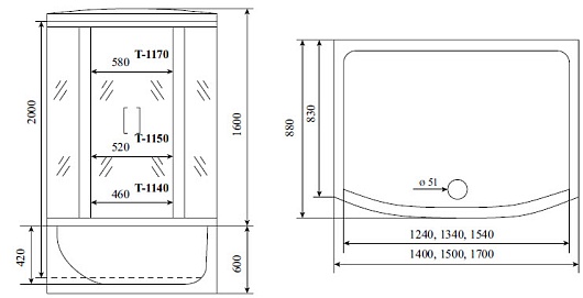 - Поддон 100% цельный акрил армирован стекловолокном, на усиленном каркасе, высота 60 см.