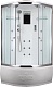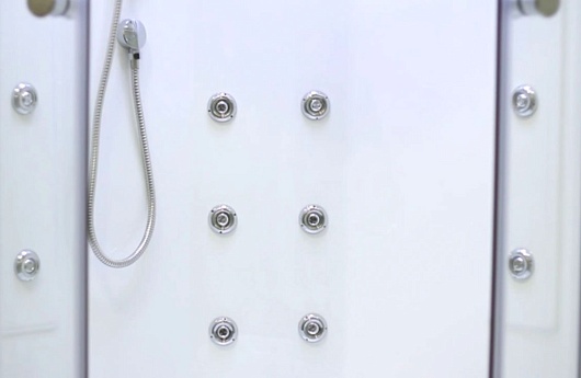 В кабине предусмотрены ручной и тропический душ с четырёхрежимным смесителем, гидромассаж на 6+6 форсунок (отдельный – специально для спины), ручки, стеклянные полочки.