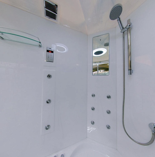 Внутри кабины установлен ручной и тропический душ, раздельный гидромассаж на 6+6 точек (отдельный – для спины), есть встроенное радио, подсветка и эффективная вентиляция. Смеситель работает в пяти разных режимах. Управление функциями осуществляется на сенсорном пульте. Предусмотрено зеркало, ручки, две полочки для принадлежностей, а также наполнитель ванны. Акриловый поддон достигает 60 см в высоту и имеет съёмный экран. Сливная система – clik-clak.