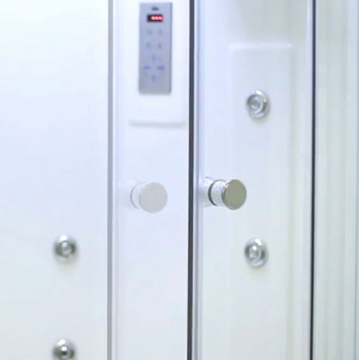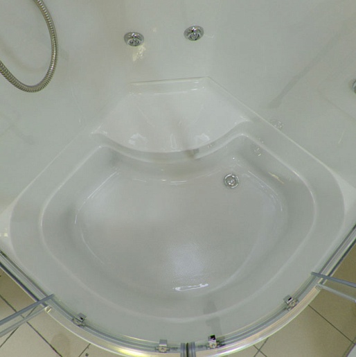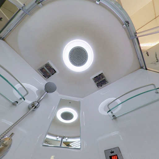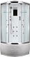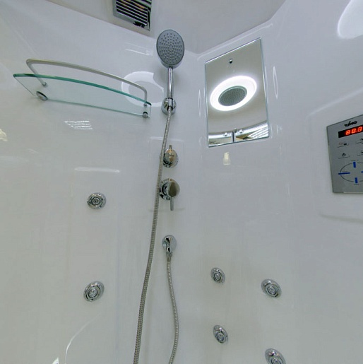 Данная модель относится к серии Lux, что гарантирует абсолютное соответствие характеристик кабин ожиданиям клиента. Любители водных процедур с комфортом смогут воспользоваться не только ручным и верхним душем, но и гидромассажем с 12-ю форсунками (шесть – специально для спины). Управление функциями осуществляется с помощью сенсорного пульта. Однорычажный смеситель работает в четырёх разных режимах. Предусмотрены ручки, а также полочки для вещей.