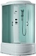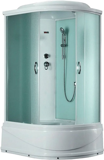 Центральная панель душевой изготовлена из санитарного АБС-пластика белого цвета. Алюминиевый профиль кабины белый, стёкла дверец – матовые. Дверцы плавно ходят на саморегулирующихся роликах. Лейка ручного душа размещается на удобной штанге, предусмотрено два режима работы. Есть и тропический душ, также возможна установка турецкой бани.