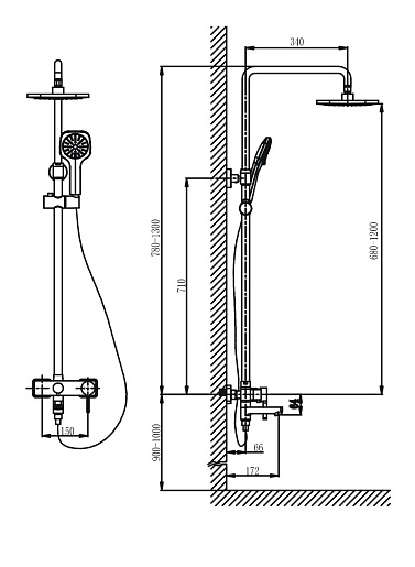 Смеситель, лейка, шланг, штанга, верхний душ, крепление