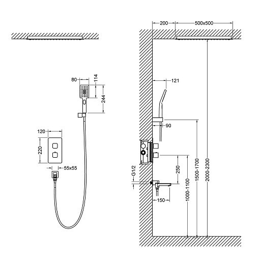 Комплектация:Смеситель с монтажной коробкой, скрытого монтажа, с термостатом - 1 шт. Тропический душ, потолочный, скрытого монтажа, (латунный) с монтажной коробкой - 1 шт. Подвесные кронштейны для тропической лейки - 1 шт. Подводка к тропической лейке 1 м - 1 шт. Ручная лейка 3-режимная (пластик) - 1 шт. Держатель ручной лейки (латунный) - 1 шт. Декоративная накладка смесителя (латунная) - 1 шт. Ручка дивертора - 1 шт. Ручка управления термостатом - 1 шт. Шланг душа 1,5 м - 1 шт. Излив-дивертор, поворотный из стены - 1 шт. Инструкция - 1 шт.