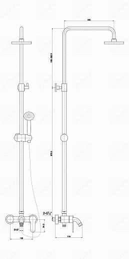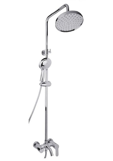 - комплектация: смеситель, шланг, лейка, штанга, верхний душ, крепление к стене