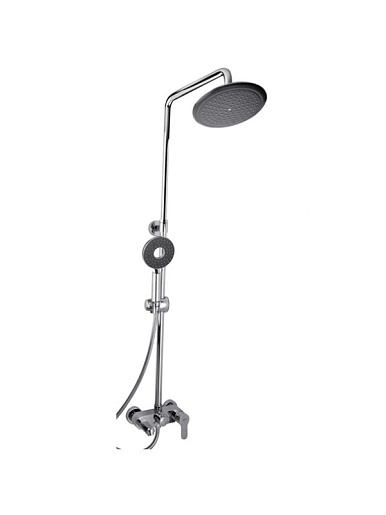 - комплектация: смеситель, шланг, лейка, штанга, верхний душ, крепление к стене