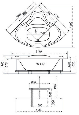Троя – это новая модель от отечественного бренда Triton в линейке ванн повышенной надёжности и в оригинальном исполнении. Изготовлена она в виде равнобедренного треугольника с округлёнными формами, чаша которой расположена по гипотенузе. Ширина и длина ванны в 150 сантиметров обеспечивают в итоге 211 сантиметров реальной длины чаши, что обеспечивает максимальный комфорт водных процедур при любом росте. Глубина ванны достигает 42 сантиметров, высота с ножками (не входят в комплект) – 63 сантиметра.