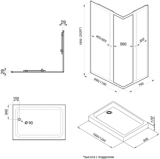 Комплектация: душевой уголок, поддон, сифон.