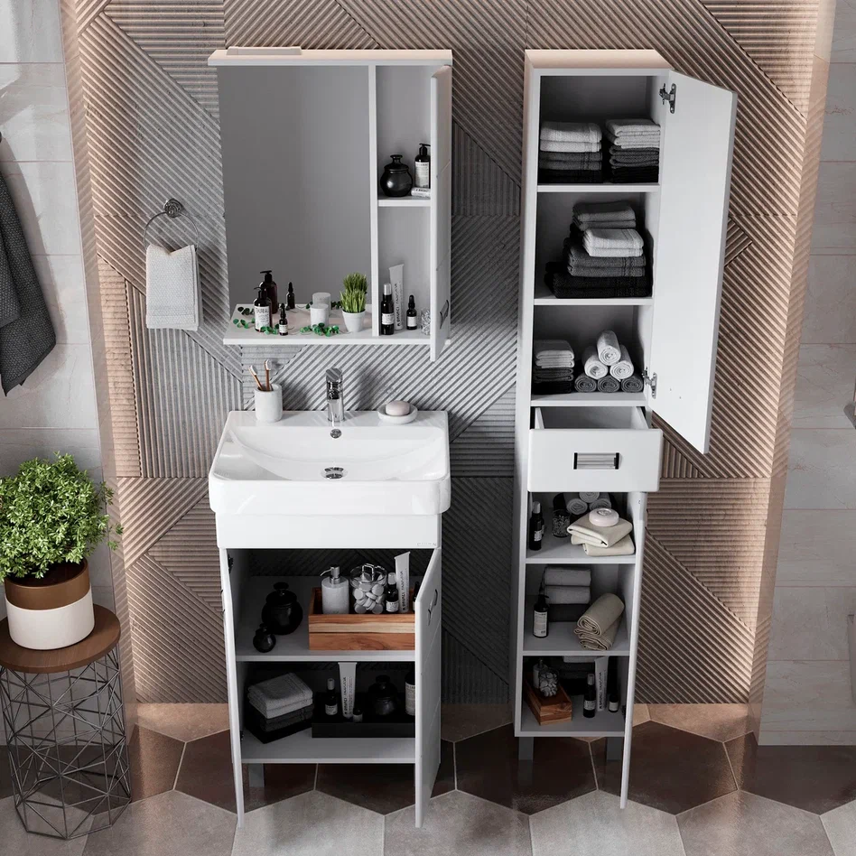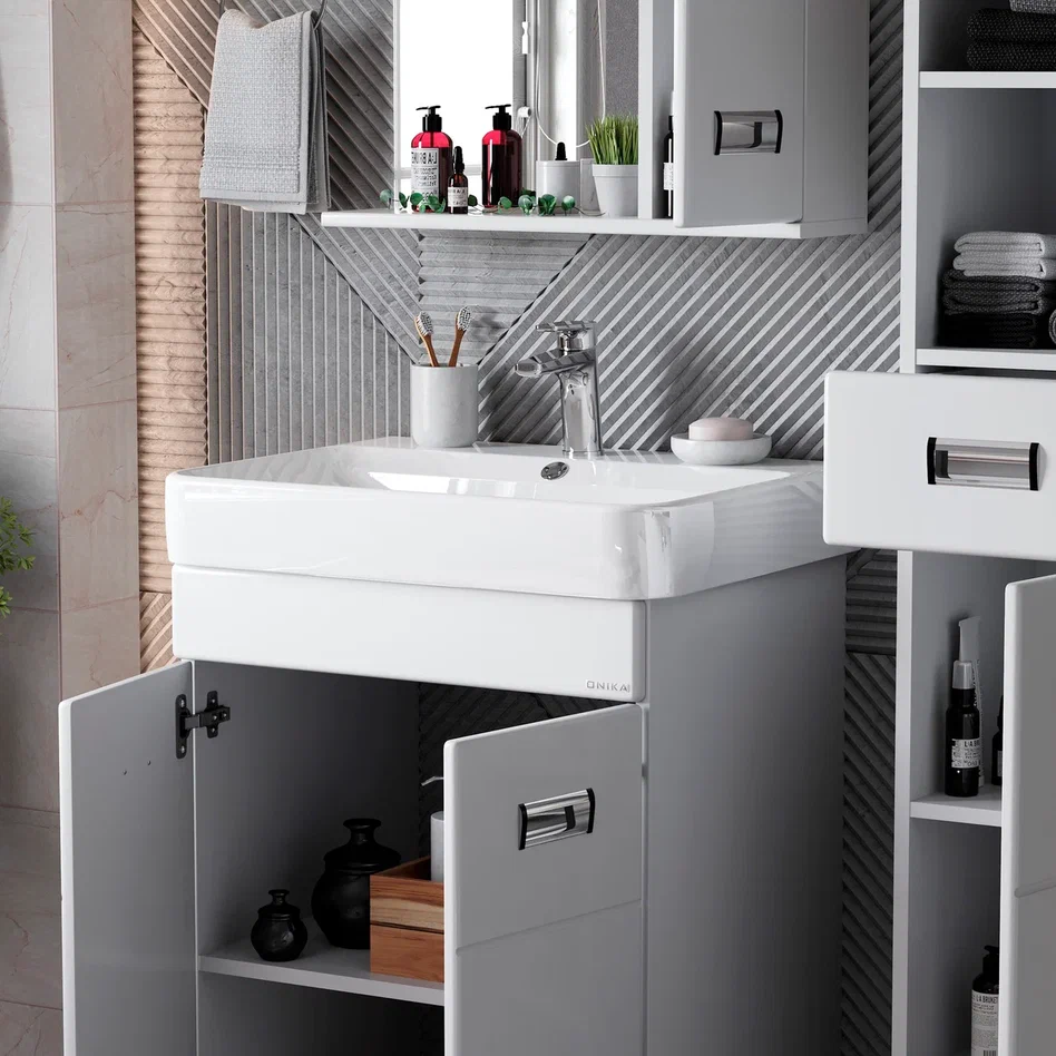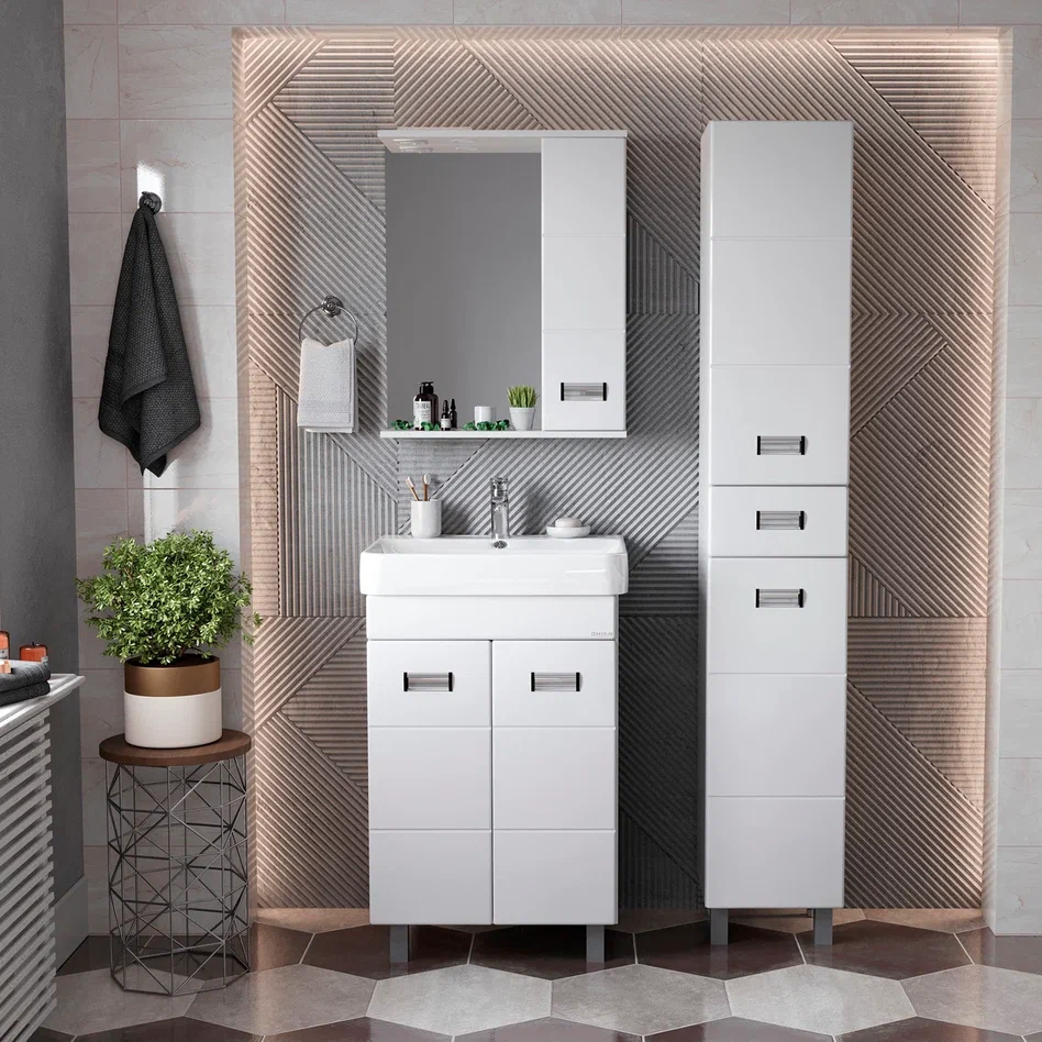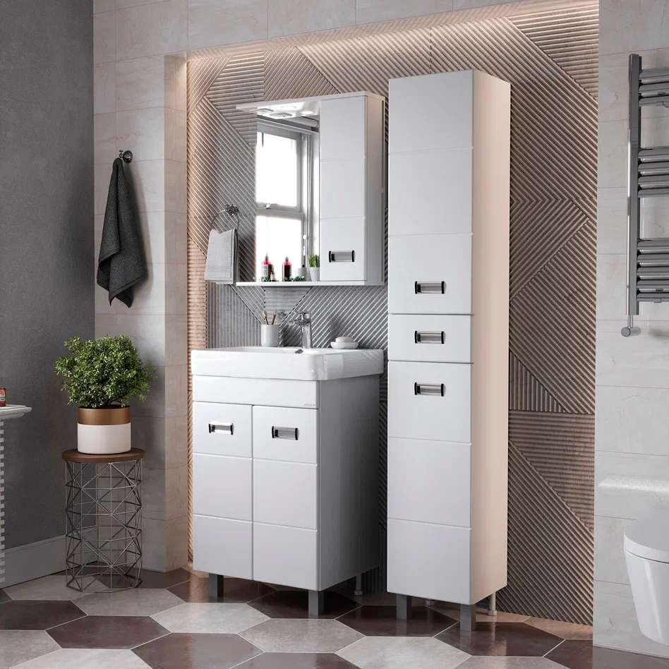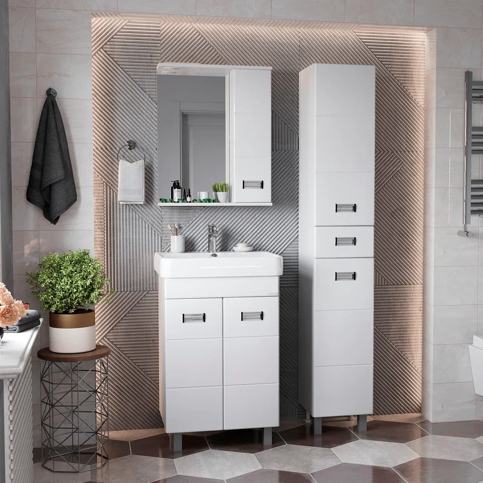 - Глянцевый белый цвет фасада, ненавязчивая горизонтальная фрезеровка, врезные хромированные ручки и аккуратная лаконичность - все это позволяет коллекции Балтика стать центральным звеном интерьера ванной комнаты.