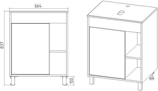 - 1 распашная дверца, 2 открытые полки.