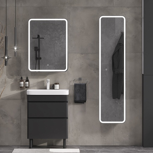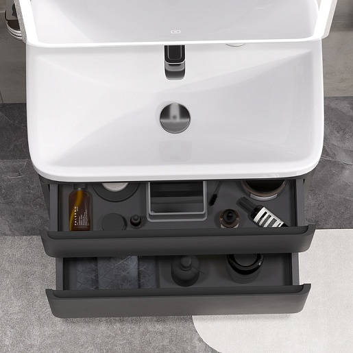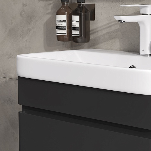 - Фасад и корпус тумбы изготовлены из МДФ и покрыты черной матовой пленкой ПВХ с эффектом Soft Touch.