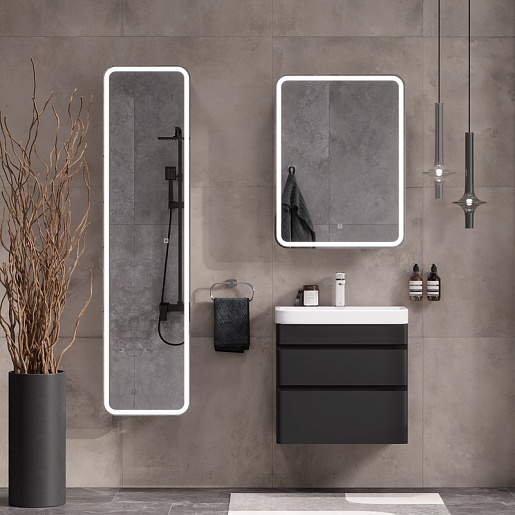 - Фасад и корпус тумбы изготовлены из МДФ и покрыты черной матовой пленкой ПВХ с эффектом Soft Touch.