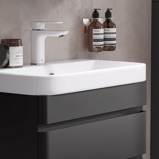- Фасад и корпус тумбы изготовлены из МДФ и покрыты черной матовой пленкой ПВХ с эффектом Soft Touch.