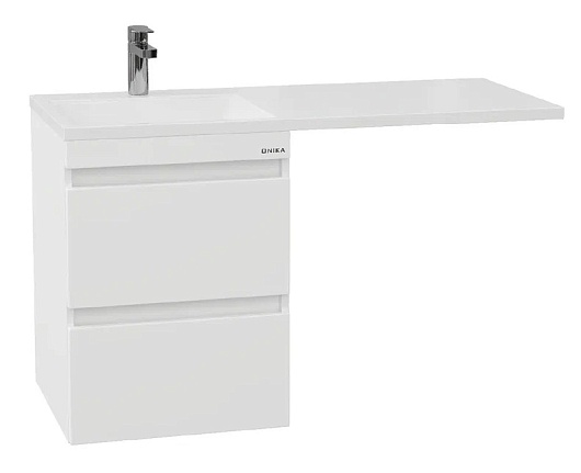- Она имеет белый глянцевый фасад, строгие формы без лишнего декора, удобные интегрированные ручки и два вместительных ящика с полным выдвижением для рационального хранения.