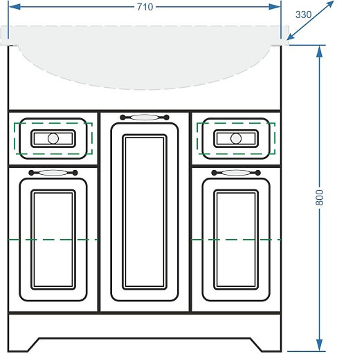 - 2 выдвижных ящика, 3 распашные дверцы.