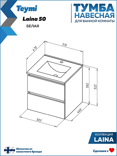 Подвесная тумба под раковину Teymi Laina 50 белая - арт. T60801.