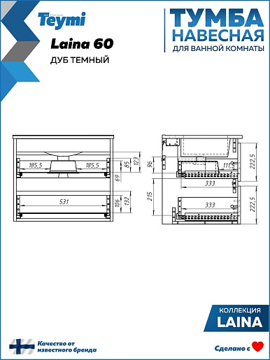 Подвесная тумба под раковину Teymi Laina 60 дуб темный - арт. T60812.