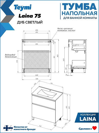Напольная тумба под раковину Teymi Laina 75 дуб светлый - арт. T60824.