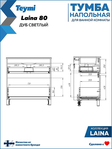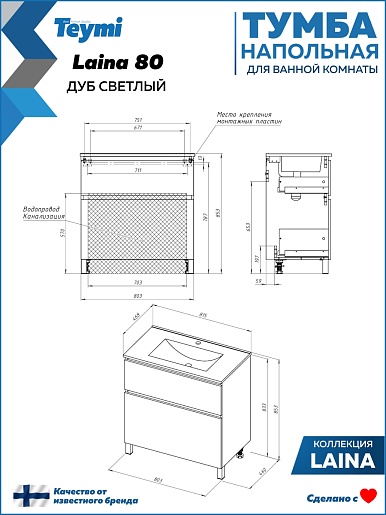 Напольная тумба под раковину Teymi Laina 80 дуб светлый - арт. T60825.