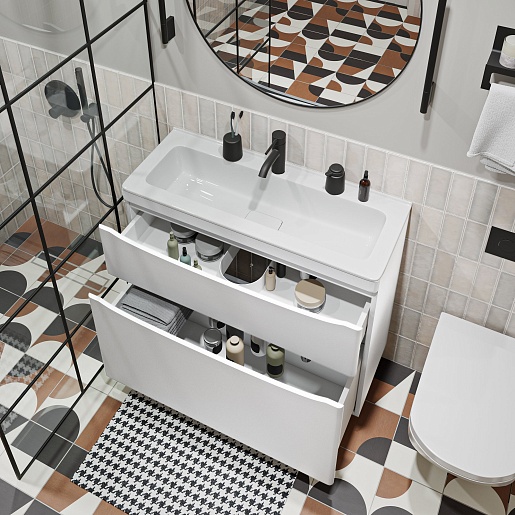 - Нижний вместительный ящик позволит эргономично разметить все необходимые ванные принадлежности.