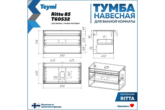 Teymi Тумба под раковину Ritta 85 дуб эврика/графит матовый подвесная T60532