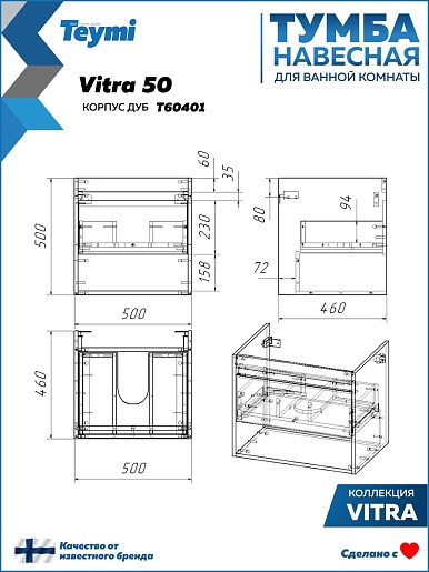 Подвесная тумба под раковину Teymi Vitra 50 без фасада дуб - арт. T60401.