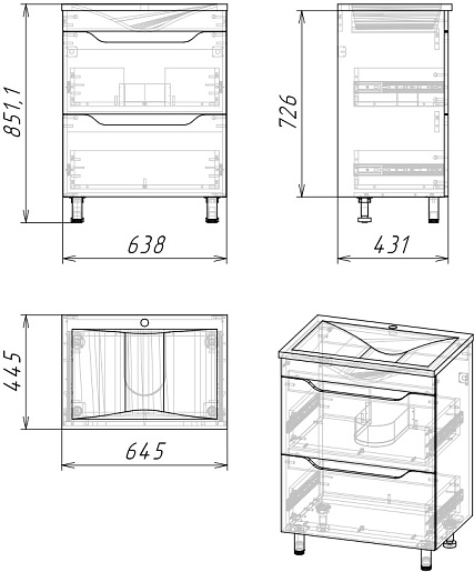 Комплектация: тумба, раковина, ножка (4 шт.).
