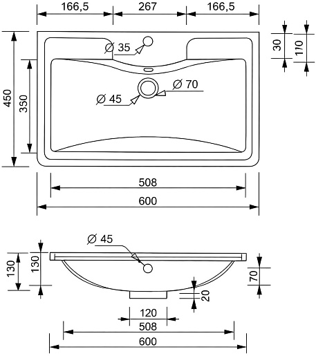 - Раковина из литьевого мрамора с отверстием слив-перелива.