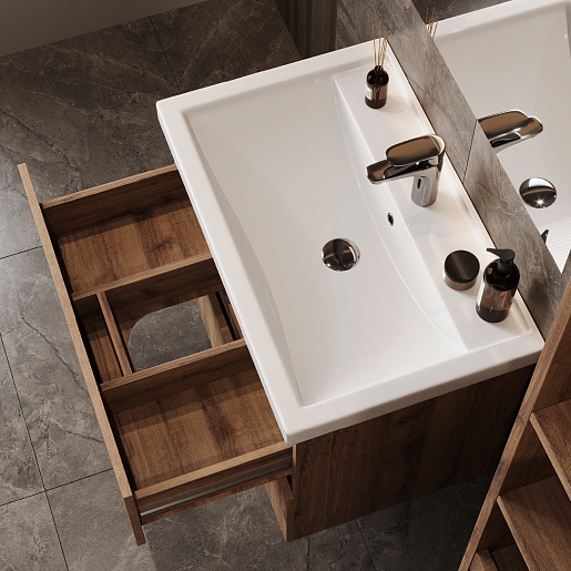 - Вместительная задняя полочка обеспечивает место для размещения необходимых мелочей, а встраиваемая в мебельную тумбу конструкция создает дополнительное пространство для хранения.