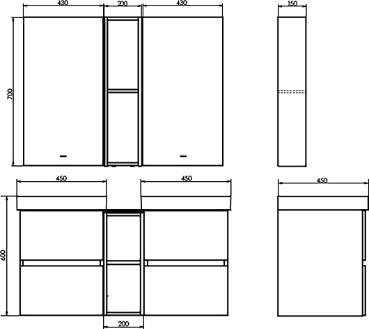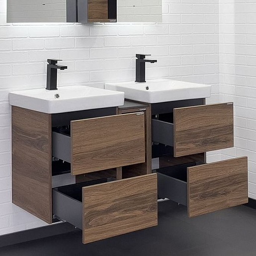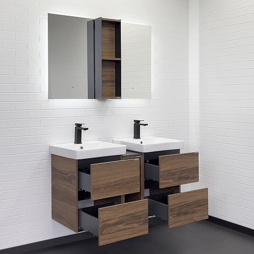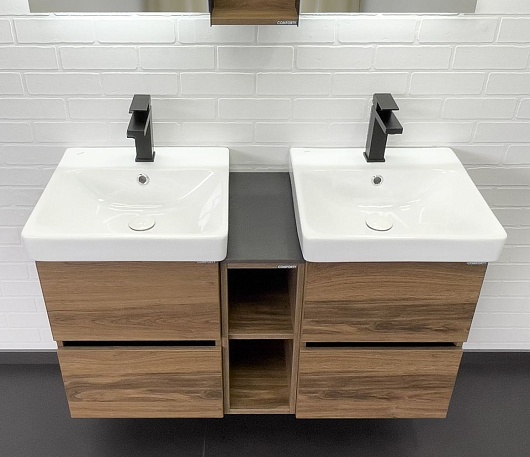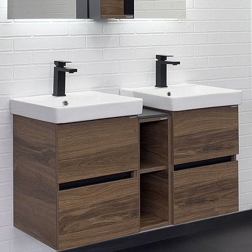 В комплекте: тумба (2 шт.), шкаф-вставка, раковина (2 шт.), крепеж.