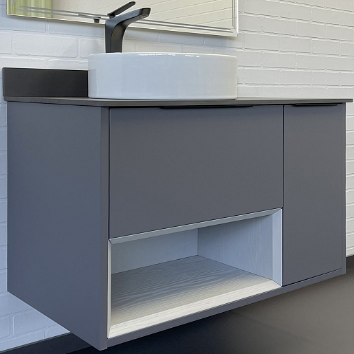 - Ниша открытого хранения сделана из МДФ в пленке серого цвета с текстурой дерева. Торцы вставки спилены под углом.