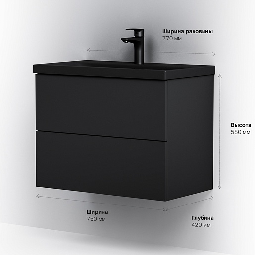 Тумба под раковину Gem 75 подвесная черная матовая
