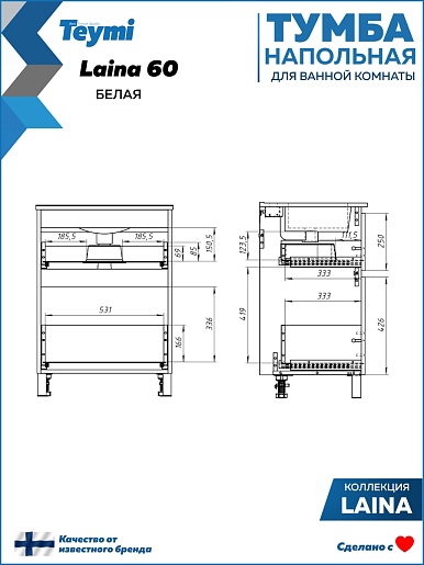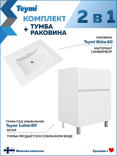 Напольная тумба с раковиной Teymi Laina 60 белая - арт. T60817 / T51002.