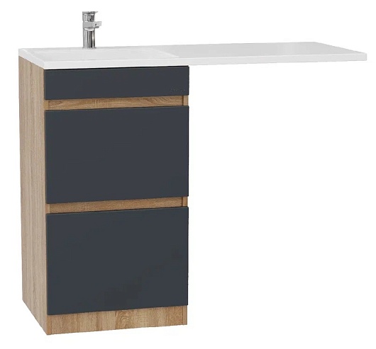 - Тумба имеет cерый матовый фасад с покрытием SoftTouch, корпус цвета дуб сонома с роскошной текстурой, строгие формы без декора, удобные интегрированные ручки и два ящика с направляющими полного выдвижения: нижний предназначен для больших предметов, а верхний, имеющий удобную систему организации пространства, - для мелких аксессуаров.