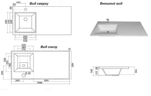 - Одно отверстие под смеситель по центру чаши. Подходит к стиральным машинам глубиной до 470 мм.