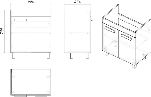 В комплекте: тумба, раковина, крепеж, ножка (4 шт.).