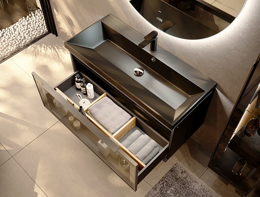 - Черная вкладная раковина из литьевого мрамора.