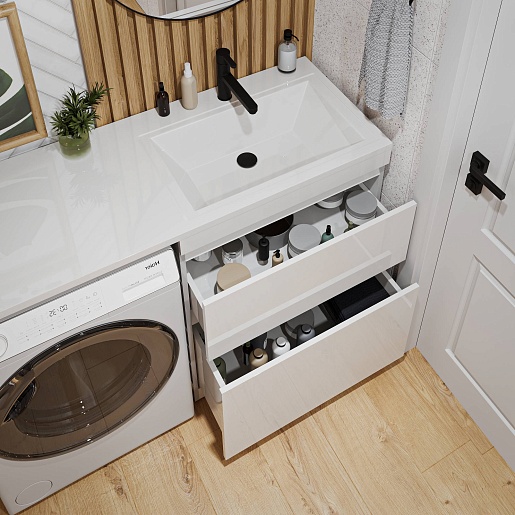 - Для размещения ванных принадлежностей предусмотрено два вместительных ящика, оснащенных направляющими с механизмом плавного закрытия - доводчиками.