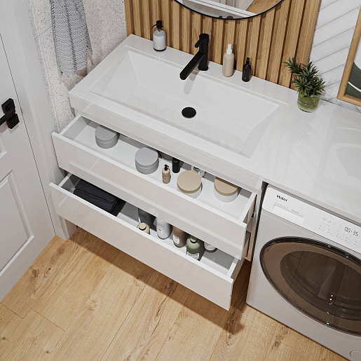 - Для размещения ванных принадлежностей предусмотрено два вместительных ящика, оснащенных направляющими с механизмом плавного закрытия - доводчиками.