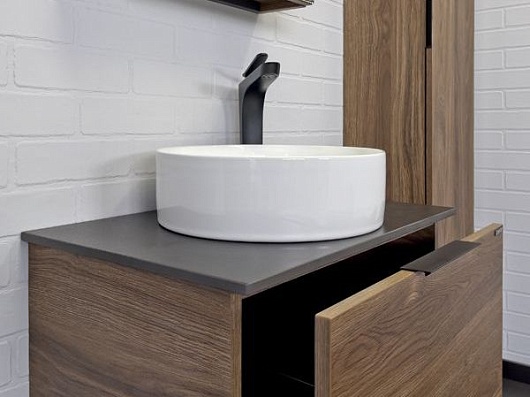 - Столешница из черного керамогранита с отверстием под смеситель.