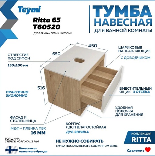 Teymi Тумба с раковиной Ritta 65 дуб эврика/белый матовый T60520 раковина T50303