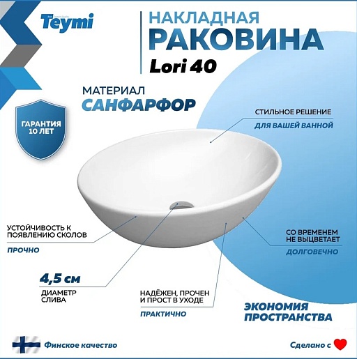 Мебельная раковина накладная Lori 40 белая T50505