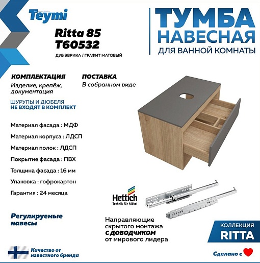 Teymi Тумба с раковиной Ritta 85 дуб эврика/графит матовый подвесная T60532 раковина T50002