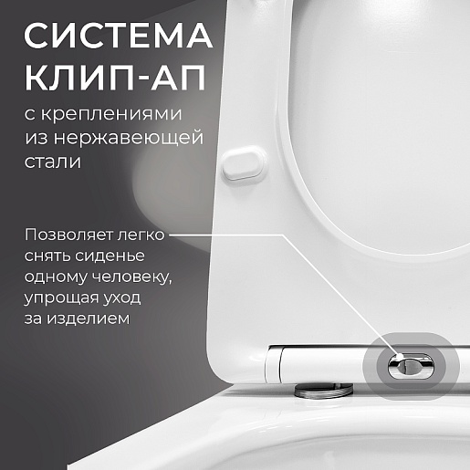 - Быстросъемное сиденье с системой плавного опускания (Soft close) и антимикробным эффектом.