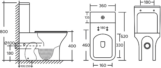 В комплекте: чаша унитаза, бачок, крышка-сиденье, механизм смыва, крепления.