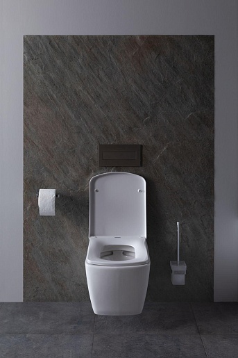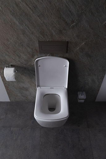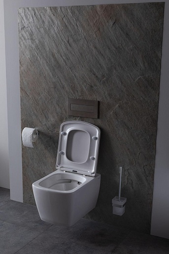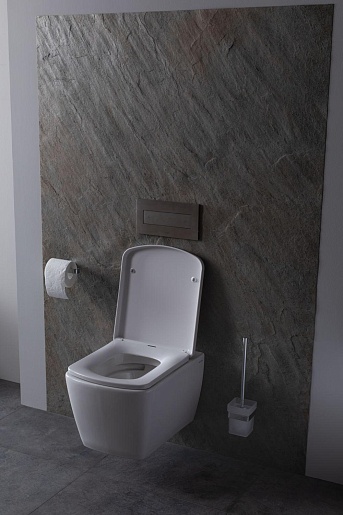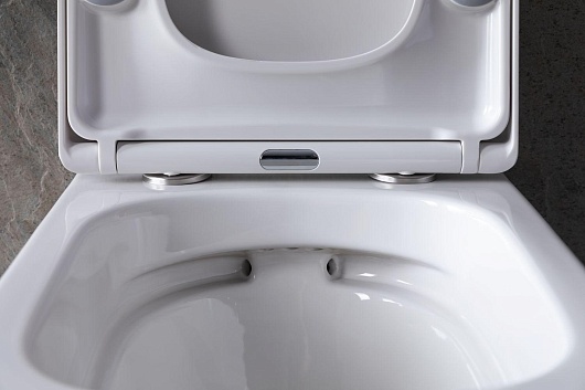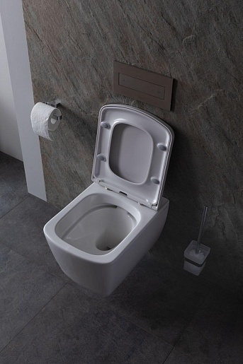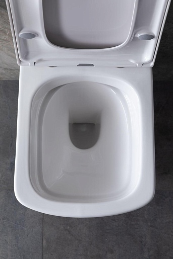 - Чаша безободковая, выполнена из белой керамики и имеет в комплекте удобную крышку-сиденье из дюропласта в цвет изделию.