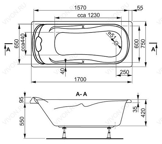 Удобная форма ванны обеспечит комфорт водных процедур: в конструкции предусмотрены специальные подлокотники, с которыми приём ванны будут на порядок удобнее и безопаснее. Стандартный диаметр слива-перелива не вызовет проблем с подключением к сети водоснабжения.
