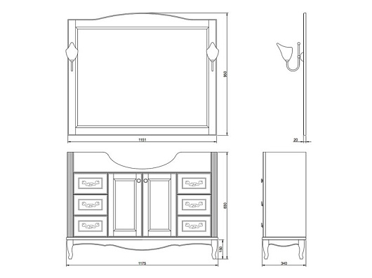 - тумба под раковину Эллина 120: 2 распашных фасада, 6 ящиков, ручки бронза